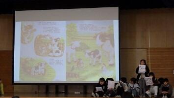 はやり児童が参加する場面を提供してくださり、和やかな雰囲気となりました。後半の話では、朗読を5名の教員が務め、演者一人がスクリーンの後ろで何役もこなしていることがよく分かりました。