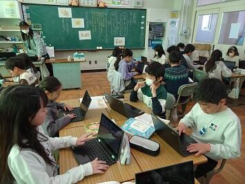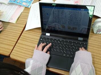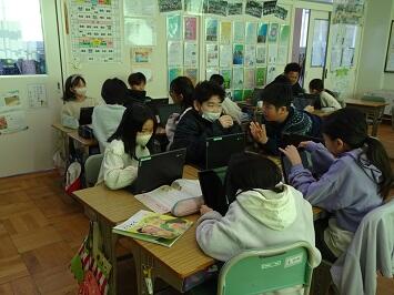 「ふくびき」という読み物資料を使って、正直な心について考える道徳授業です。学習端末を有効に活用して、自分の考えを書き加えていました。随時、班で意見交換を繰り返して自分の考えを深めていました。