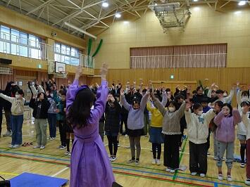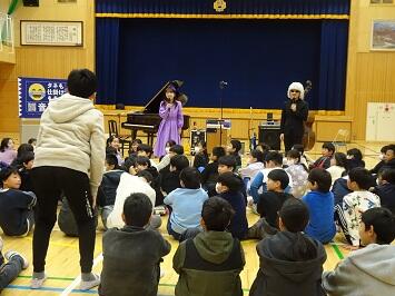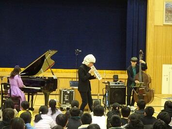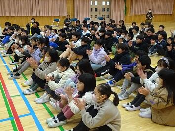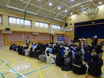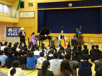 では、後半の下学年の部です。演奏家4名の皆さんが奏でる音にノリノリの児童がたくさんいました。そして、楽しい音楽に乗って豊かな表情を見せていました。