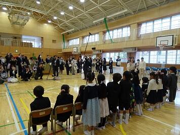学校長祝辞の途中で、在校生及び新入生と共に「さんぽ」を大きな声で歌ってアットホームな雰囲気を盛り上げました。そして、PTA会長様からのお祝いの言葉をいただきました。そして、いつものように在校生の大きな声で歌う校歌は圧巻でした。