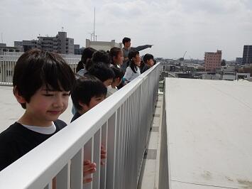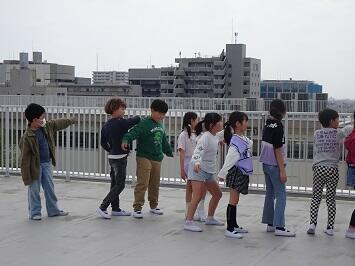 社会の学習で屋上に上がり、東西南北を見渡す景色の相違点について探しました。はじめに、教室で学んだ4方位がどちらになるのか担任と確認しました。そして、それぞれの方角ごとに何が見える意見を出し合いました。