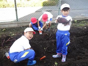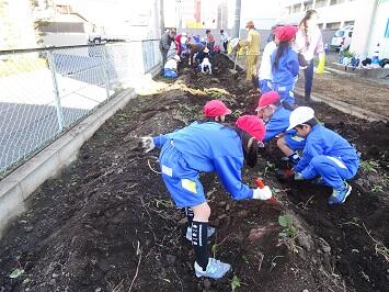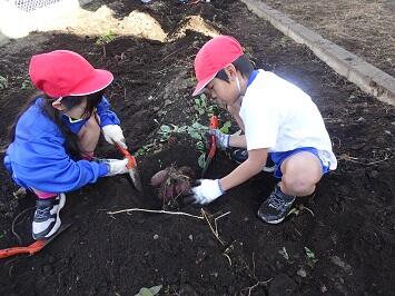 校地西側の農園に植えたサツマイモの苗が順調の育ち、収穫の時期となりました。苗を植え、様子を観察してきた1年生が手にシャベルをもちながらお宝の芋を掘り起こしました。まるまると大きく育った芋をたくさん手にして、児童は大喜びでした。