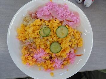 本日の給食は季節の行事に合わせたメニューにしました。3色ゼリーもついて豪華な感じがします。ちらしずじも子供が食べやすい味付けになっています。