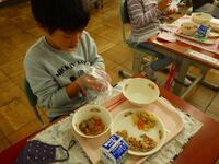 「おにぎりの日」は、各自で握ったおにぎりを家から持参する特別な日。それに先立ち、給食で配膳されたわかめご飯を使って、握り方を実践しました。