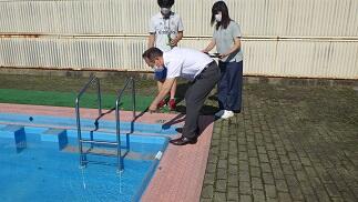 本日,プール開きを行いました。お酒や塩,米,かつお節などでお清めをして,安全を祈りました。