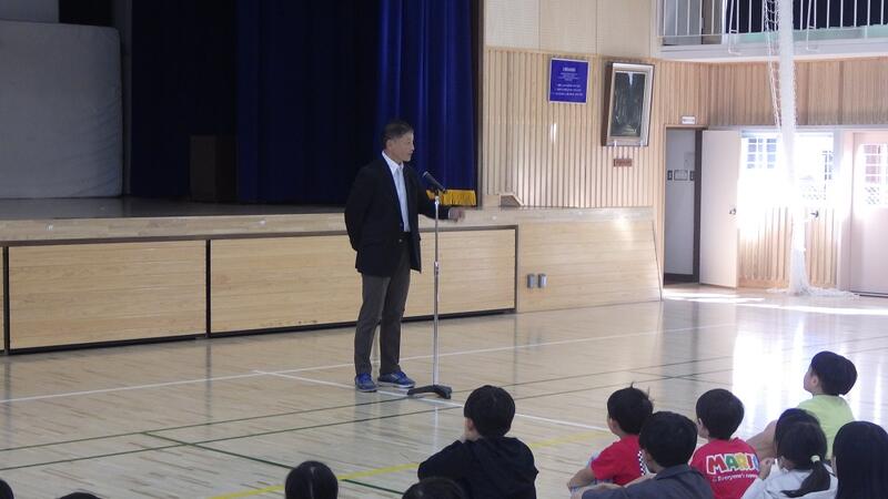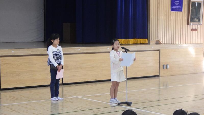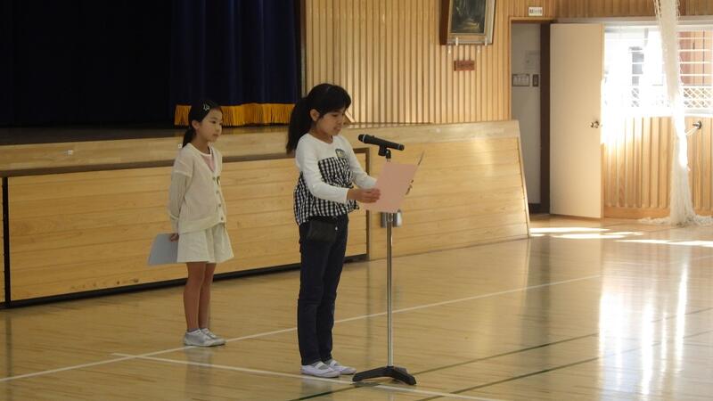 次に,校長先生が,「1学期の多読賞の人は,毎日2冊ずつ本を読んだ計算になります。がんばりましたね。また,ある雨の日に,昇降口で上級生が下級生の傘をしまってくれているのを見かけました。そのように,困っている人に手を差し伸べられる児童が増えてきていて嬉しいです。2学期も元気・がんばり・思いやりを大切に頑張っていきましょう。」とお話になりした。