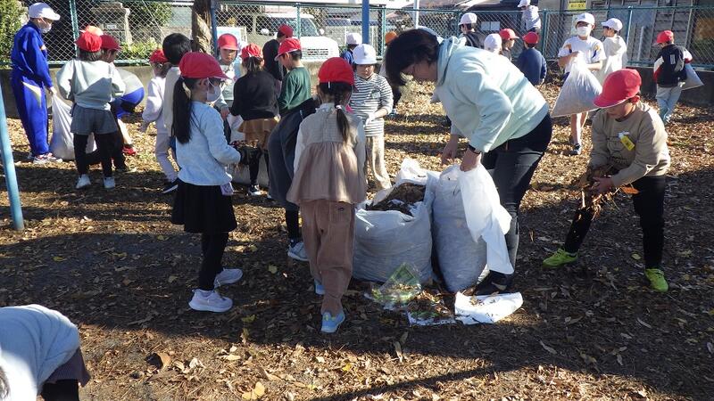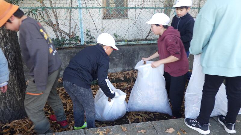 環境委員会が主催し「落ち葉拾い大会」を行いました。校庭の落ち葉をたくさん拾えるか競い合うゲームです。どのクラスも必死で落ち葉を集め,ごみ袋の山が出来上がった程です。