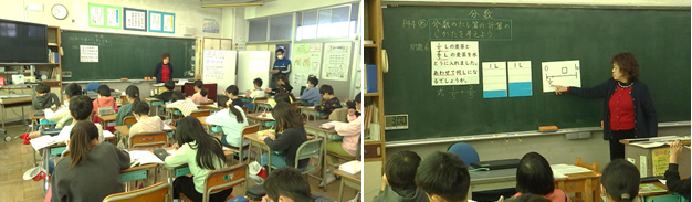 本日3校時,校内研修で,3年1組が算数の授業を公開しました。分数の足し算の場面です。児童は,担任の話をよく聞き,全員が真剣に取り組んでいました。