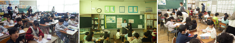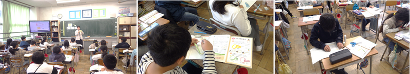 4年生算数の授業です。つないだ輪を切ってできる形から,図形について考えを深め,図形感覚を養う内容です。実際にやってみると難しく,児童は夢中になって取り組んでいました。
