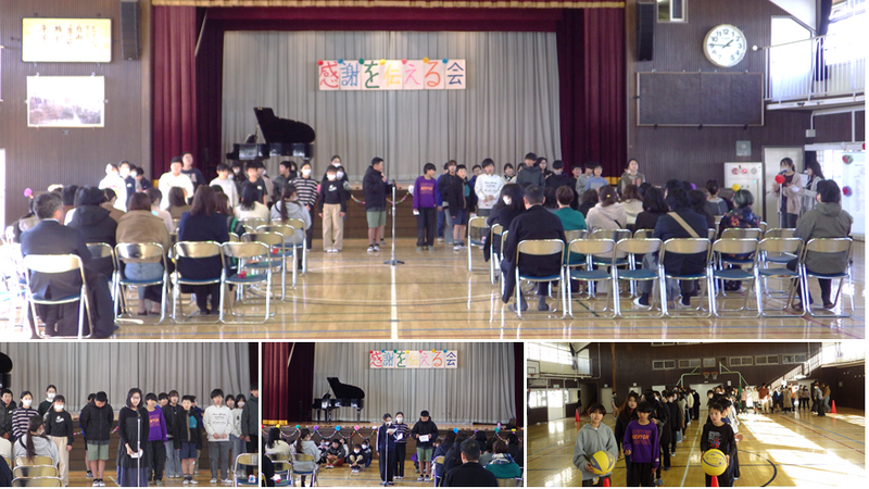 6年生は,体育館で「感謝を伝える会」を実施しました。保護者の前で,一人一言感謝の言葉を述べ,「親子タイム」で簡単なレクリエーションを行い,最後に「音楽のプレゼント」を送りました。