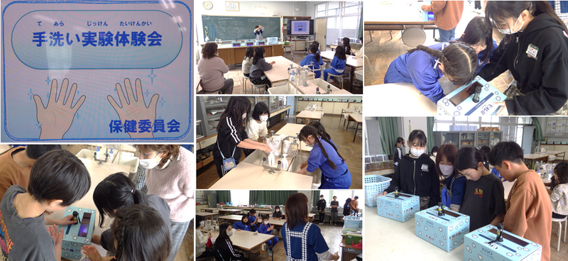 昼休み、保健委員会で手洗い実験体験会を行いました。まず、蛍光クリームをつけ、いつものように石鹸で手洗いをします。ハンカチでふいた後ブラックライトに当てると、よごれが青白く光り、洗い残しを確認することができました。参加した児童は、自分ではきれいに手を洗ったつもりでも洗い残しが多いことにとても驚いていました。正しい手洗いについて確認することができました。