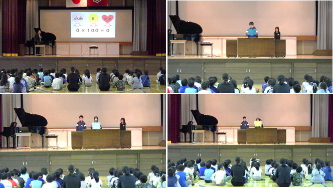 終業式では,校長から「骨のある人」についての話が,その後,児童指導主任から「安全な過ごし方」についての話がありました。また,1学期に頑張ったことについて,3名の児童が発表をしました。