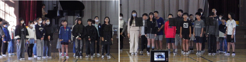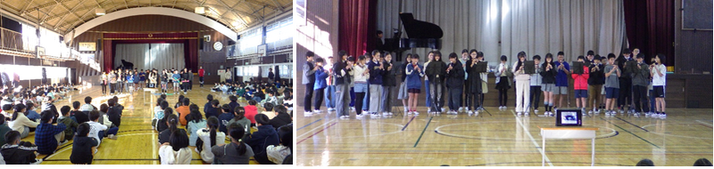 本日は,第2回音楽集会を全校朝会で行いました。6年生による発表です。まず,「クラッピングファンタジー第7番楽しいマーチ」を全員でリズムアンサンブル,その後リコーダーの演奏と合唱を発表しました。練習の成果を十分に発揮できました。