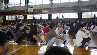 中学生の司会で,火の神が登場しスタート。岡本北小は,火の神から1組「協力の火」2組「友情の火」3組「希望の火」をいただきました。オープニングセレモニーの後,各学校が出し物を行いました。岡本北小学校は,進化じゃんけんを担当しました。司会やゲームの説明を堂々と行う姿は,とても頼もしく感じました。