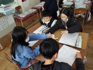 4年生の授業では,ペントミノのどこに正方形1つをつなげると立方体の展開図になるかを見つけ,それを見つけるコツについて考えました。面の位置関係に着目すると,展開図を考えやすいということが分かりました。授業中には使わなかったペントミノがあと9種類あると聞き,子供たちは自主学習でやりたいと意欲的でした。