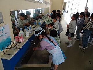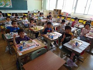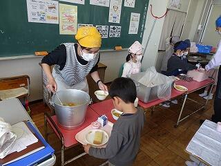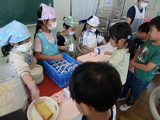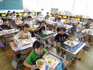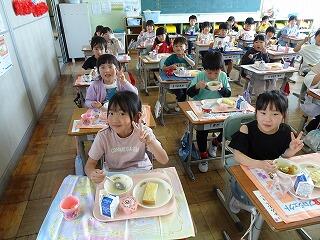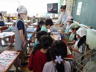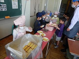 初めての給食当番の仕事は,先生に教えてもらいながら上手にできました。岡本北小学校の給食のお味は,どうでしたか?