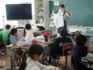 まず,子供たちは身の回りにあるたくさんの布製品を使用目的別に分け,布製品は目的に合った布で作られていることに気付きました。その後,本時では「エプロンの布はどうしてその布(織り物)が使われているのか。」という理由について考えました。それぞれの布の特徴を調べ,「エプロンの布は,丈夫で伸びづらい織り物が適してる。」ということが分かったようです。