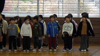 1年生の発表は,「森のくまさん」,「フルーツケーキ」の2曲です。可愛らしく元気いっぱいな歌声が体育館に響きました。「フルーツケーキ」の2番は,1年生のオリジナル。ラーメンを題材にした楽しい歌詞に,すずやカスタネットの音色がぴったりでした。
