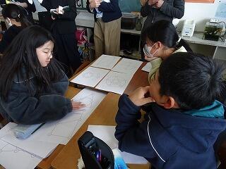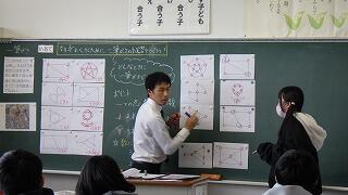 授業は,6年生算数「一筆書き」でした。いくつかの図形について一筆書きができるかどうか確かめた後,一筆書きができる条件について考えました。条件を調べるための視点を基に,グループで話し合い,点に集まる線の数を調べることで一筆書きができるかどうか判断することができることが分かりました。