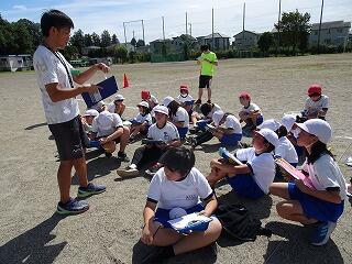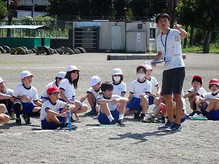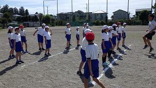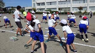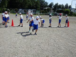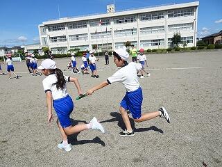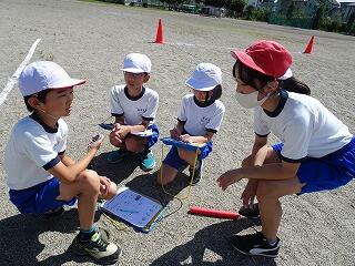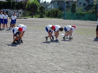 「バトンパスのタイムを縮めよう」というめあてに向かって,チームで協力し練習に取り組みました。走力向上のためのドリルの後,テイクオーバーゾーン内のタイムを計測しながらバトンパスの練習をしました。途中,タイムを縮めるための工夫について話し合い,その後,渡し手,もらい手双方の動きを考えながら,タイムを向上させようと意欲的に練習に励む姿が見られました。