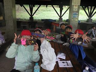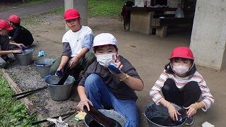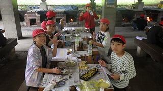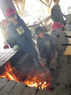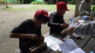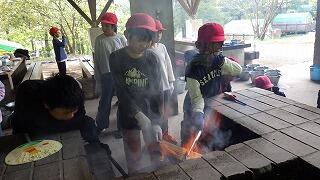 冒険活動教室1日目は,小学校2校合同入所式を行った後,園内オリエンテーリングと杉板焼を行いました。杉板焼きでは,火が起きるまで時間がかかった班もありましたが,冒険活動センターの素敵なお土産「杉板焼き」を作ることができました。