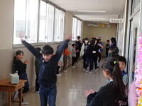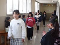 給食後に,1~5年生が廊下に並んで,卒業する6年生とお別れ会,お見送りを行いました。廊下に並ぶ在校生の間を,ゆっくりと歩いていく6年生。1~4年生は,今日で6年生とお別れですので,今までお世話になった感謝の気持ちを込めて,手を振ったり,言葉を掛けたり,拍手をしたりして見送りました。