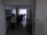 地震により給食室から火災が発生したという想定で行いました。1年生は小学校に入学して初めての避難訓練でしたが,しっかりと担任の話を聞き避難することができました。また,教職員も消防署の方々に消防ホースについて教えていただきました。