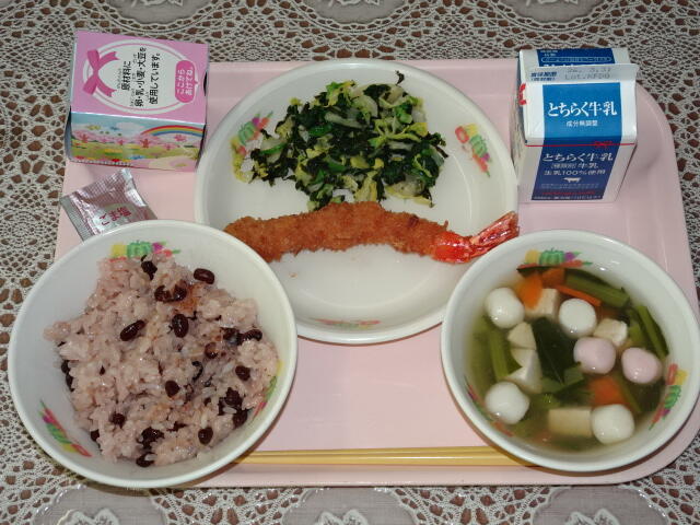 一覧へ 今日の給食「6年生卒業お祝い給食」 日時 2026年03月17日(火) 公開対象 パブリック 詳細 今日の献立は「6年生卒業お祝い給食」です。6年生の皆さん,もうすぐ卒業ですね。どうぞ味わってください。 赤飯 ごま塩 牛乳 えびフライ 磯辺あえ 紅白すまし汁 いちごのロールケーキ お祝いケーキも付いています。 作成者 桜小学校管理者 更新日時 2026-03-17 12:12:48