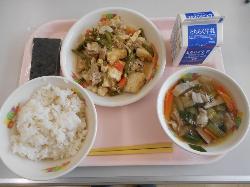 一覧へ 今日の給食 日時 2026年02月16日(月) 公開対象 パブリック 詳細 麦入り御飯 牛乳 生揚と豚肉の豆板醤炒 はくさいスープ 韓国のり 作成者 桜小学校管理者 更新日時 2026-02-17 15:17:11