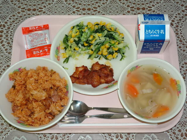 一覧へ 今日の給食 日時 2026年01月29日(木) 公開対象 パブリック 詳細 今日の給食は,給食委員が考えた献立です。 ジャンバラヤ(麦入りごはん) 牛乳 ミルメーク(コーヒー) ジャークチキン ゆで野菜(コールスロー) ポテトスープ 作成者 桜小学校管理者 更新日時 2026-01-29 12:03:02