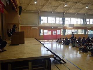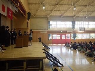 各学年の代表が修了証を受け取り、代表児童の作文発表や校長先生のお話を、子供たちは一年の締めくくりにふさわしい立派な態度で聞いていました。