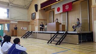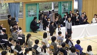 各学年の代表が修了証を受け取り、代表児童の作文発表や校長先生のお話を、子供たちは一年の締めくくりにふさわしい立派な態度で聞いていました。
