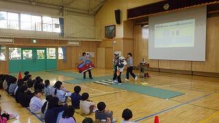 分かりやすい絵や写真を使ったスライド、実物を使用しての体験学習、クイズなど、工夫の行き届いた内容で、子どもたちはとても熱心に参加し、交通安全への意識を深めました。