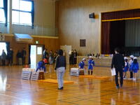 1・2年生は,生活科の学習で「あきまつり」を行いました。2年生が1年生を招待しました。1年生は「あきまつりバス」に乗って体育館に到着した後,2年生のお話を聞いてスタートしました。
