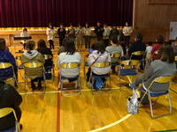 第3回目の「ぷち避難訓練」がありました。緊急地震速報が流れ,これまで通り,教室で活動していた児童は速やかに自分の机の下へもぐることができました。オープンスペースで活動していた児童は,教室に戻らず,最も近いテーブルの下にもぐることを選び,危険を回避する判断力も磨かれてきました。