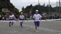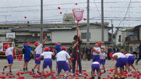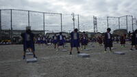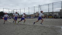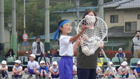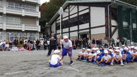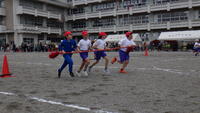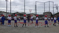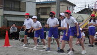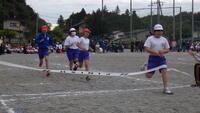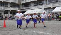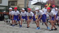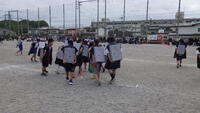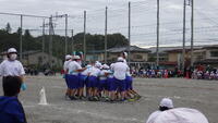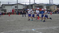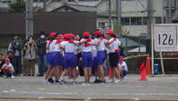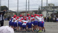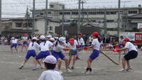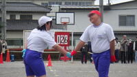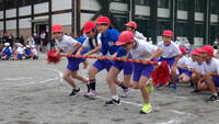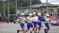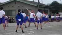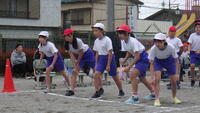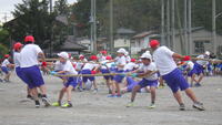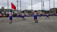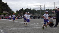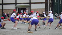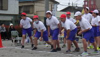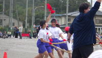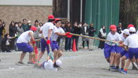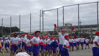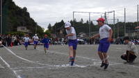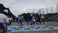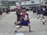 陣取り合戦です。中央に横たわる縄を自陣に引き寄せ,縄を片手で持ったまま,もう一方の手で旗を早くとった方が勝ちです。旗は自陣の中央に1本のみ。作戦が重要なので,戦う前に作戦タイムがあります。初めは女子,次に男子の順に激しい攻防が繰り広げられました。
