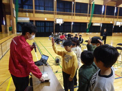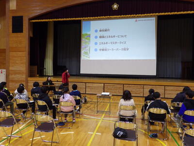初めに体育館で「エネルギーと太陽光発電所システム」についての説明を聞き,