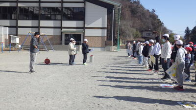 保護者の方にもご参加いただき,なかよし班(縦割り班)ごとに分担場所の落ち葉や枯れ枝を集め,