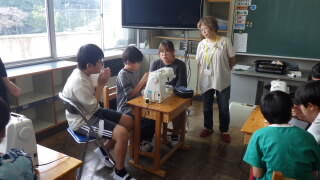 家庭科の学習で、はじめてミシンを使う5年生の子供達です。