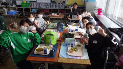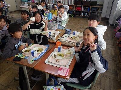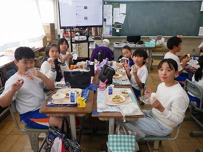 児童は給食の時間に、大小さまざまなおにぎりをおいしそうにほお張っていました。