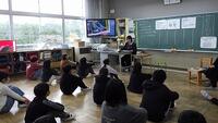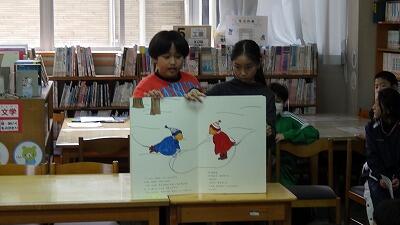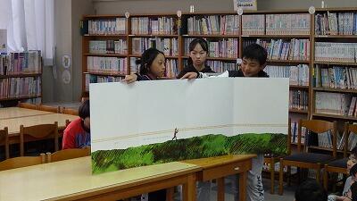 5・6年生の大型絵本の読み聞かせに、集まった児童たちは真剣に聞き入っていました。