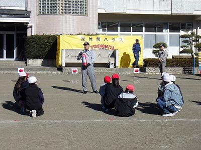 消火訓練では、消火器の使い方について教えてもらい代表の児童と先生方が体験しました。
