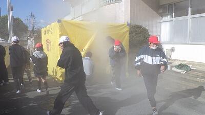 煙道訓練では、小さなテントの中に煙が充満していて子供たちは驚いていましが、