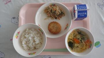 沖縄県うるま市交流献立 タコライス・沖縄みそ汁 宮っ子ランチ(冬) 黄ぶなランチ 里芋のコロッケ