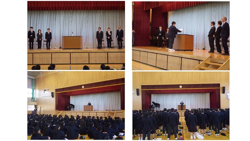 始業式に先立って行われた着任式では、今年度から本校に赴任された先生方をお迎えしました。新任の先生方からのご挨拶のあと、代表生徒が「歓迎の言葉」を述べ、全校生徒の温かい拍手で新しい先生方を歓迎しました。