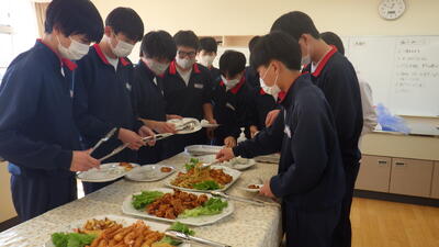 会場(家庭科室)に入り、ずらりと並んだ色とりどりの料理を目にした生徒たちからは、思わず歓声が上がっていました。 唐揚げやポテト、いちごなど、調理員さんが腕を振るってくださった豪華なメニューに、生徒たちの箸も進んでいました。