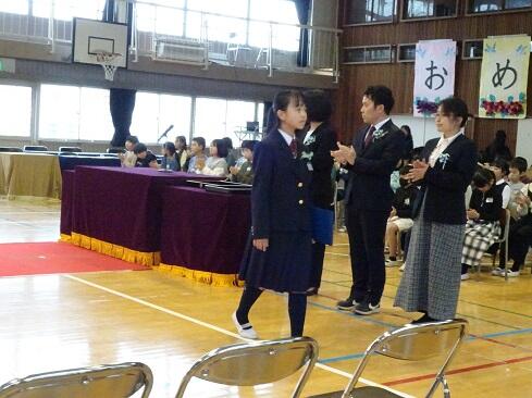 「離任者のことば」を6名の先生方からいただいた後,「花束贈呈」「児童代表お別れのことば」などを行い,子どもたちは離任する先生方に感謝の気持ちをもって,花のアーチでお別れすることができました。