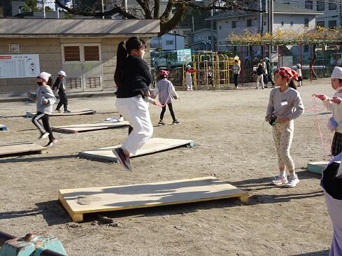 1月30日(火),昼休みの時間を活用して,恒例の「みんなでピョンピョン跳びっ子隊」を実施しました。今回の参加チームは低学年生。主催は児童会運動委員会です。開催の目的は,学級で仲間と協力しながら,運動する楽しさや達成感を味わい,体力の向上を図るとともに,望ましい人間関係を構築することです。内容は,長なわ跳びです。途中で止まっても跳んだ数を合計します。時間は3分間。目指すは記録の自己ベストですが,4クラスが近くで跳んでいるので回数を競いたくなってきます。「勝ちたい」とか「一番なりたい」と思うことは,児童期ではよいことだと思います。実施は2日間です。どのクラスも自己最高記録を目指してほしいものです。さて,各クラスでは,なわを回す担当児童もいます。みんなのためにありがとう。あなたのおかげで,クラスのみんながリズムに乗って気持ちよく跳べました。みんなが活躍できました。ナイスチームワーク!