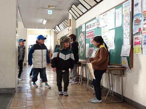 1月16日(火),本日の防犯パトロール担当は,地区まちづくり協議会所属の地域ボランティアの皆さんです。1.2年生の下校に付き添い,安全を確保していただき感謝いたします。雪も降る低い気温の中,ありがとうございました。