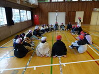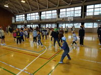 雨天だったので,教室や体育館で楽しく「なんでもバスケット」や「ハンカチ落とし」「ドッジボール」などをしました。